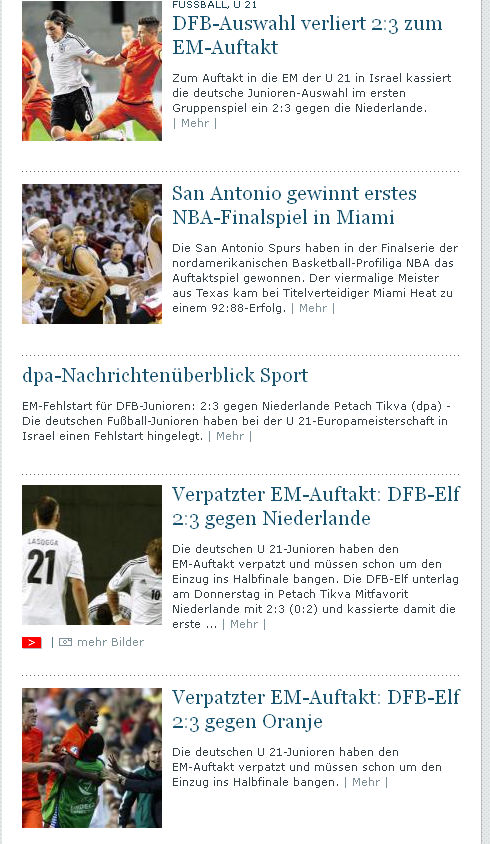 Viermal die gleiche Nachricht auf der Sport-Übersichtsseite. Ein Screenshot von echo-online.de.